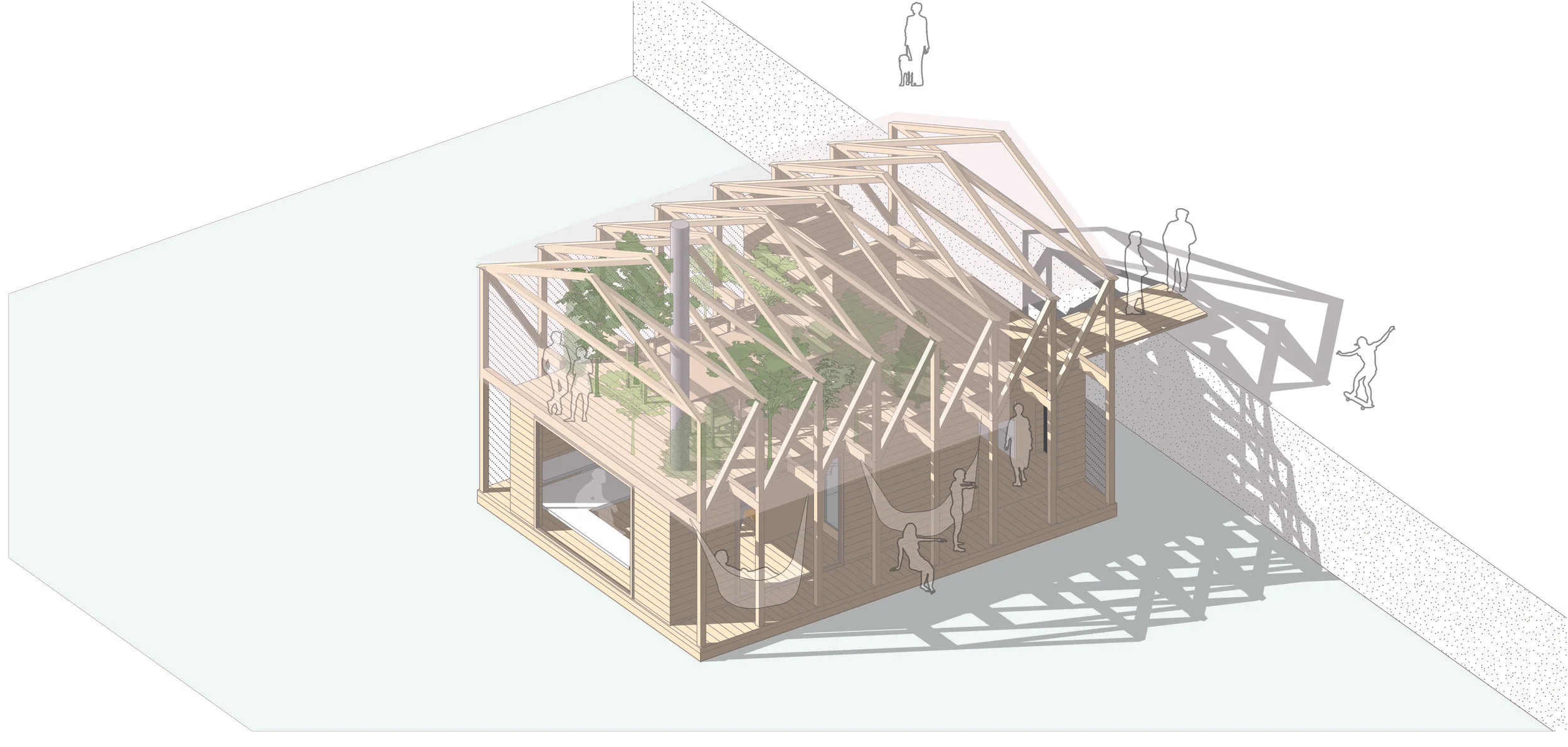 Green Lantern is a floating timber sauna and glasshouse. The sauna functions are on the lower level and the glasshouse is above. The glasshouse is filled with vegetation and warmed by the sauna beneath. At night or on dark winter evenings, the glasshouse will glow like a green lantern in Oslo Harbour!